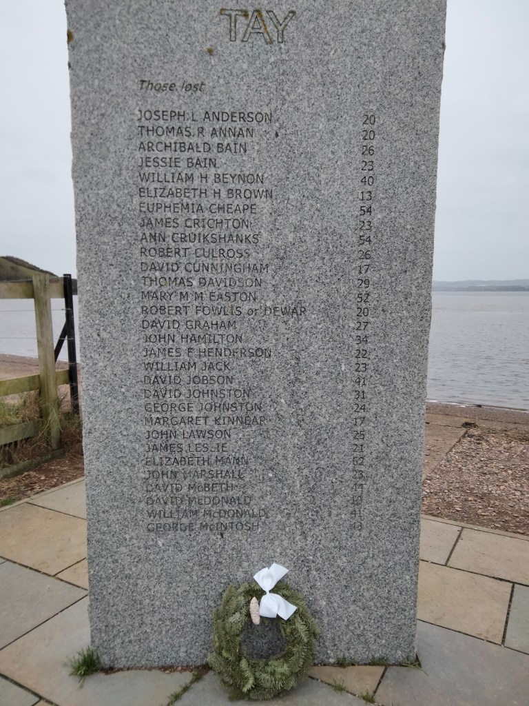 Every year, on the anniversay of the disaster, I undertake make my annual ‘Wormit pilgrimage’ to lay 2 small wreaths (see 2 pictures above) at the memorial. The first picture shows a wreath for all the victims. The second picture shows a wreath at the left stone for Margaret Kinnear (17) who was related to someone I know.